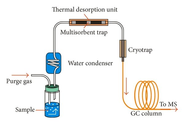 吹掃和捕集方法(動態(tài)技術(shù))的基礎(chǔ)是用惰性氣體(通常是氦氣或氮氣)吹掃樣品(液體或固體);然后將揮發(fā)性化合物吸附在捕集器上,捕集器立即被加熱,將其解吸到氣相色譜儀進樣器中。有許多吸附劑,如Porapaks、Chromosorbs或Tenax系列,都能滿足正確的熱解吸的必要要求;然而Tenax系列(基于2,6-二苯基對苯二胺的聚合物)非常適用于水醇樣品,如葡萄酒或類似的飲料。在這個意義上,已經(jīng)提出使用吹掃和捕集方法來分析水果和果汁以及酒精飲料。