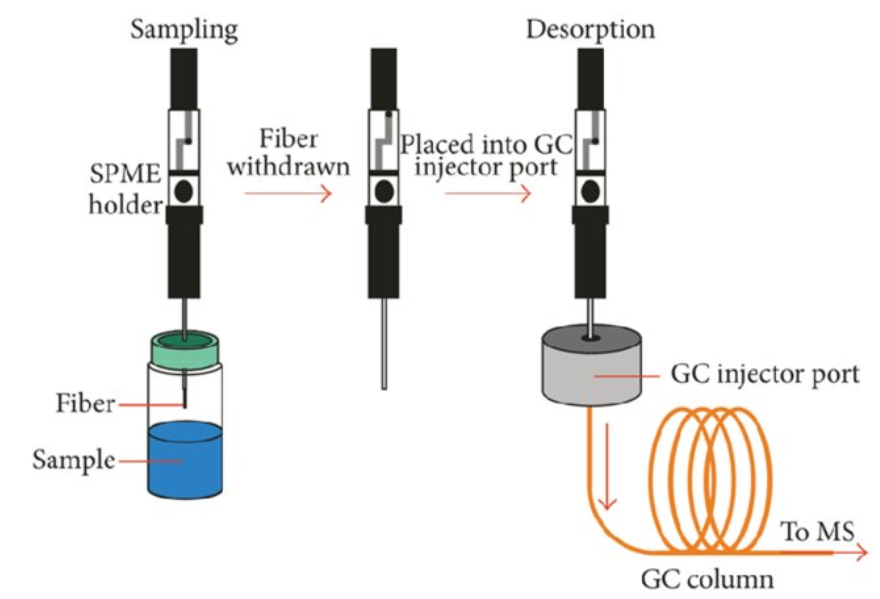 SPME是一種無溶劑的方法,集成了采樣、提取和濃縮分析物的功能。與溶劑萃取相比,SPME是一種非完全的萃取技術(shù),只有一小部分目標分析物從樣品基質(zhì)中被萃取出來。這種技術(shù)的好處是便于攜帶,有可能實現(xiàn)自動化,并提高靈敏度,此外,在頂空(HS)模式下使用時,被動采樣方法不會干擾樣品。
