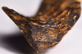 鷹木香殼果實(shí)明顯大而且果皮有皺褶 在結(jié)香油線上,比一般的莞香樹和蜜香樹粗大,木質(zhì)疏松,受傷之后一般容易大面積結(jié)香,因?yàn)闅夂虻年P(guān)系,其木質(zhì)部分樹脂腺的演化,和越南高棉等中南半島所有不同,最大的差別在樹干肉質(zhì)的顏色比較深,結(jié)香的面積通常很大,所結(jié)沉香塊大而氣味穩(wěn)定。味道上,生聞香氣很明顯濃郁,穩(wěn)定,紋理清晰,所以是手串和雕件的上等材料。燒起來味道不好聞,因此一般不適合制作線香、或熏燒。