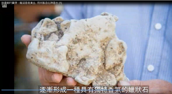 偶爾會有些難以消化的固體物質(zhì)進(jìn)入抹香鯨的腸道并隨著腸道的蠕動進(jìn)入直腸,與糞便混合并使糞便結(jié)成半固體狀。因?yàn)槟ㄏ泠L的正常糞便是液態(tài)的,它的肛門也不能排出固態(tài)的糞便,這些半固體狀會堵塞直腸,導(dǎo)致排便困難。為了使排便恢復(fù)暢通,它只好加強(qiáng)了腸壁對糞便中水分的重吸收,使阻塞物體積縮小,并透過腸道蠕動使其表面變得光滑,形成糞石。這樣一來,液態(tài)的糞便就能通過阻塞物和直腸壁的空隙排出了。但阻塞物就像一個(gè)小水壩,截留了糞液帶來的新的固體物,于是糞石越裹越大,并在抹香鯨的腸道中經(jīng)過細(xì)菌和各種酶的復(fù)雜加工,最終形成龍涎香。大約100頭抹香鯨中,只有一頭體內(nèi)有龍涎香。雖然糞石本身對抹香鯨沒有太大的危害,但如果長得太大,就可能使腸壁破裂,最終導(dǎo)致抹香鯨的死亡。1914年,就有一位捕鯨人在抹香鯨腸道中發(fā)現(xiàn)過一塊重達(dá)455公斤的龍涎香。